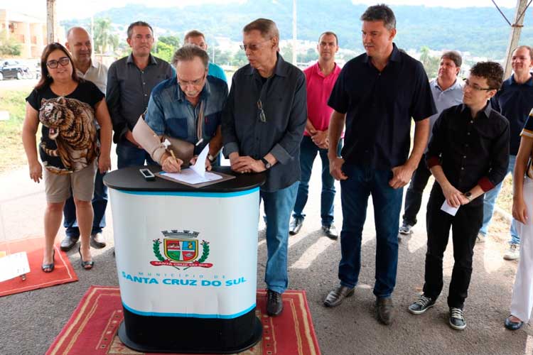 O prefeito Telmo Kirst assinou na manhã deste sábado, 13, o termo de início das obras de canalização da Sanga São João, na Rua Professor Antônio Koehler. A nova estrutura, que promete ser uma nova Avenida do Imigrante, fica nas proximidades do Parque São Luís e Ginásio do Sesi, no Bairro Arroio Grande.