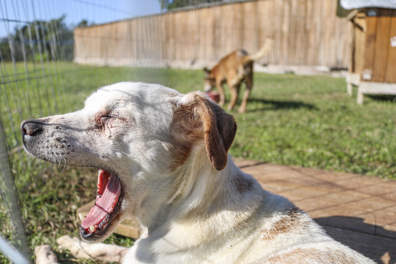 Bryan chegou em janeiro, após ter sido encontrado dentro de um saco de lixo, depositado num dos contêineres localizados pelas ruas de Santa Cruz. Touro, com seus 12 anos de idade, já passou mais da metade da vida por lá. Nessa sexta-feira, inclusive, completou sete anos desde que foi resgatado e passou a viver no abrigo. Os vovôs Truco, Panda e Frodo também colecionam suas histórias sofridas e tentam esquecê-las, num belo banho de sol no pátio.