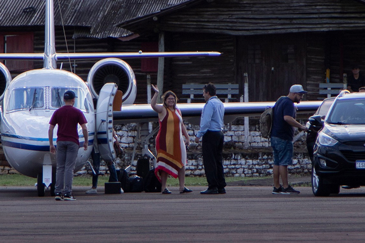 Logo após o pouso, a cantora foi até o local onde os fãs aguardavam, fez fotos com eles e conversou com os presentes. Ela ainda confessou, antes de chegar à área onde os fãs estavam – na grama -, que tinha medo de sapos. Entre risos, os que aguardavam puderam registrar a chegada da artista no município e garantir a tão sonhada selfie.