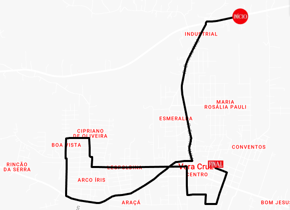 Em Vera Cruz, a caravana partirá da sede da Coca-Cola Femsa, às margens da RSC-287, às 17 horas. O comboio entrará na cidade pela Rua Ernesto Wild, passando pelo trevo da empresa Kopp, e seguirá até a Rua Jacob Doern, de onde avança em direção à Rua Jacob Schneider e, após, a Rua Senador Pinheiro Machado, avançando até o cruzamento com a Rua Olívio Fischborn, próximo ao Bairro Rincão da Serra. Dali, ingressa na Rua Rudy Merten, ao lado da escola Elemar Kroth, e vai até a Rua João Arthur de Assis, no Bairro Boa Vista.
