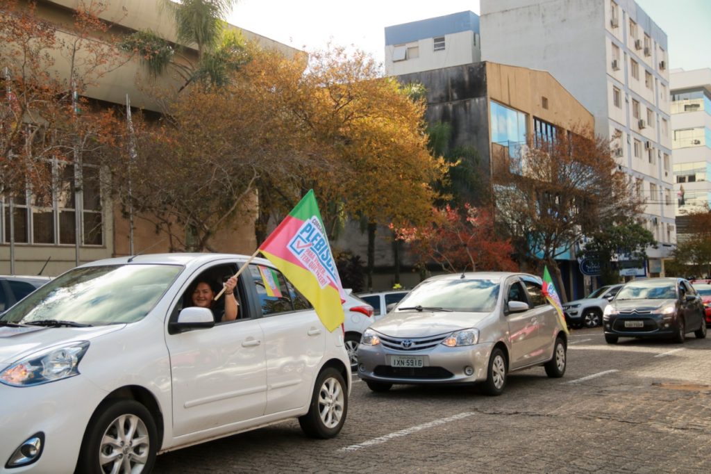 Puxados por um carro de som, dezenas de automóveis circularam com bandeiras, faixas, cartazes e buzinas pelas ruas Tenente Coronel Brito, Senador Pinheiro Machado, Marechal Floriano, Tiradentes e Marechal Deodoro, concentrando-se em frente à agência do Banrisul.