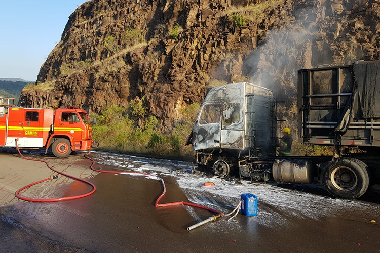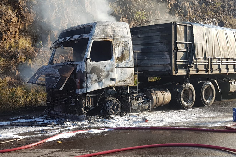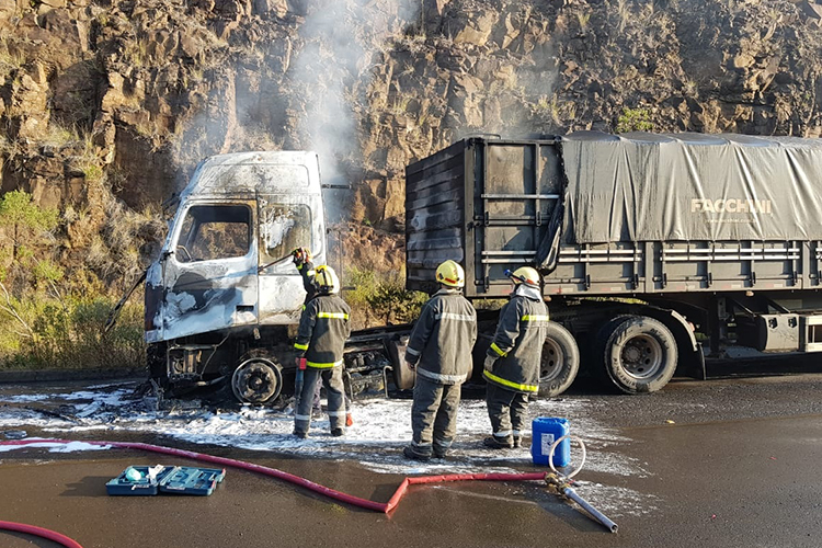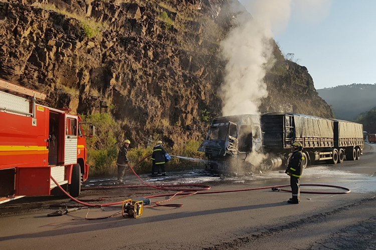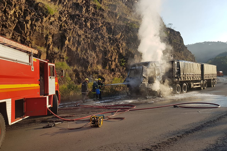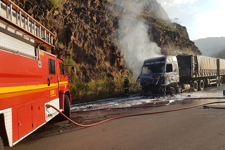 Uma carreta pegou fogo sobre a pista da RSC-153, em Vale do Sol, na tarde desta sexta-feira, 17. O motorista relatou ao policiamento rodoviário que percebeu um problema mecânico no veículo e parou, no quilômetro 302 da rodovia, por volta das 15 horas. Ele desceu da cabine e, logo em seguida, o incêndio começou, no motor do caminhão. O trecho não tem acostamento e, por isso, o veículo ficou sobre a pista. A carreta é emplacada em Itaqui (RS).