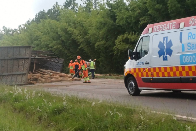 Uma carreta que transportava uma carga de toras pela RSC-287 tombou na manhã desta quarta-feira, 11, na altura do quilômetro 80+600, em Venâncio Aires, próximo ao acesso da localidade de Linha Bem Feita. Conforme a concessionária Rota de Santa Maria, o sinistro provoca alteração no trânsito, que flui por um desvio no local. Funcionários da companhia atuam na remoção da carga.