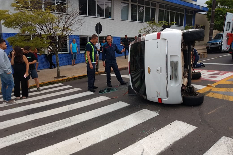 Uma colisão envolvendo dois veículos resultou no capotamento de um Meriva, no Centro de Santa Cruz do Sul, na manhã desta quinta-feira, 16. Segundo a Brigada Militar, por volta das 10 horas um Meriva branco, placas de Arroio do Tigre colidiu contra um Agile cinza. A colisão ocorreu na esquina das ruas Tiradentes com Assis Brasil.