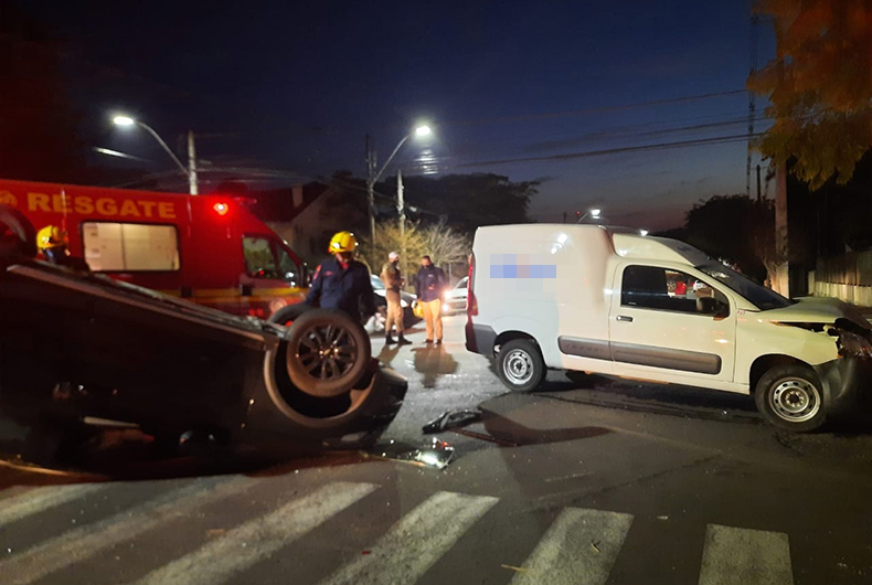 Um carro capotou após uma colisão com uma caminhonete no Centro de Santa Cruz do Sul. O acidente aconteceu por volta das 18 horas, no cruzamento das ruas Venâncio Aires e Capitão Fernando Tatsch.