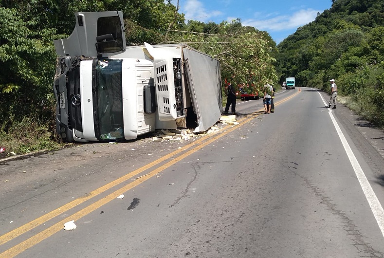 Segundo o Corpo de Bombeiros Voluntários de Candelária, que atendeu a ocorrência, o acidente com o caminhão ocorreu no quilômetro 12, no sentido Sobradinho/Candelária. O motorista relata que teria ficado sem freio e jogou o caminhão para fora da pista. Com isso, o veículo acabou tombando. Os dois ocupantes não ficaram feridos, e o caminhão tinha placas de Cordilheira Alta, Santa Catarina.