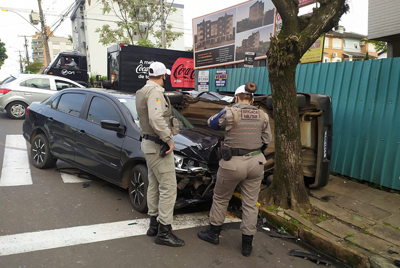 Um Fiat Uno tombou e acabou parando sobre a calçada, após um acidente na esquina das ruas Augusto Spengler e 28 de Outubro, no Bairro Universitário, em Santa Cruz do Sul. A colisão aconteceu por volta de 7h30 desta sexta-feira, 17, e envolveu ainda um VW Voyage.