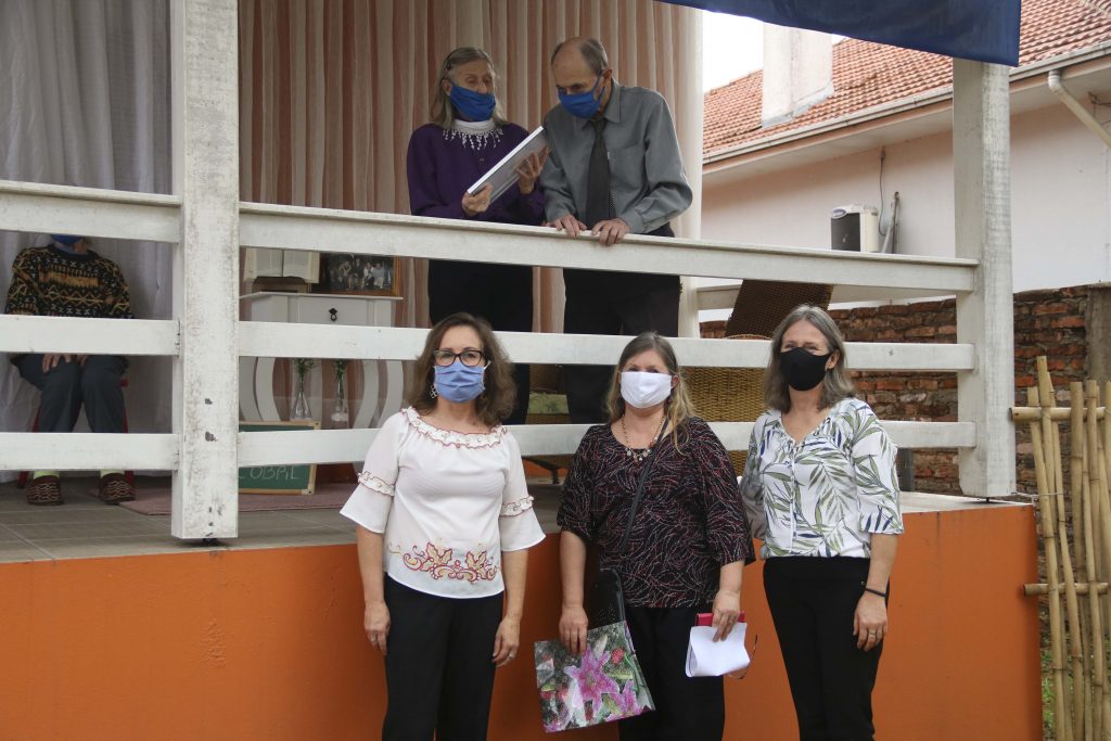 A tarde dessa sexta-feira, 24, foi especial para o casal Herberto Gollmann, de 87 anos, e Silda Gollmann, 83, residentes da Instituição de Longa Permanência para Idosos (Ilpi) Reviver, em Santa Cruz do Sul. Uma celebração de bodas de cobre – de 61 anos de casados – foi realizada no local com a presença de três dos quatro filhos: Cleonice Gollmann, Elaine Bencke e Irlete Vargas. Apenas o filho Clóvis Gollmann não pôde comparecer. No pátio da instituição, mantendo o distanciamento exigido pelas regras de prevenção ao coronavírus, as filhas fizeram sua homenagem. Da sacada da varanda, os idosos retribuíram com acenos.
