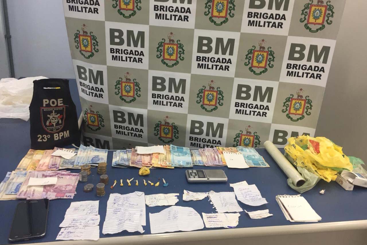 Foram encontrados no local uma balança de precisão, uma porção de cocaína, sete pedras de crack, dinheiro e um celular. Além disso, o casal guardava anotações com valores, nomes de clientes e lucro obtido através da venda das substâncias. O homem e a jovem, de 19 anos, foram presos e encaminhados até a Delegacia de Polícia para a autuação em flagrante por tráfico de entorpecentes e associação ao tráfico.