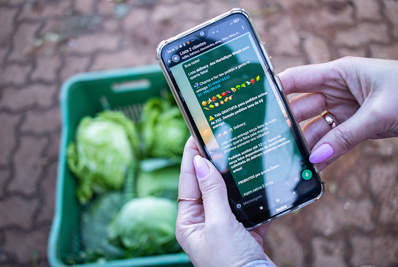 Érica recorda que, no auge da pandemia, com as feiras e restaurantes fechados e as demandas dos mercados em queda, o casal começou a buscar alternativas para comercializar a produção. “Víamos lojas vendendo em lives e nas redes sociais e começamos a pensar se seria possível vender hortaliças por meio da internet.” Eles então criaram uma página no Instagram para divulgar os produtos. “Em um domingo eu vim aqui, tirei umas fotos e comecei a abastecer. Também pedia para eles fazerem outras imagens durante o trabalho”, revela.