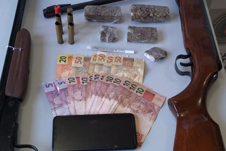 Os policiais adentraram a moradia e lá encontraram 4 porções de maconha, que pesaram 96,5 gramas; um cigarro de maconha; duas armas de foto artesanais de calibres 36 e 22. Também foram apreendidos três celulares e R$ 330,00 em dinheiro. O homem foi revistado e com ele a BM afirma ter encontrado 50 gramas de maconha e R$ 50,00 em dinheiro.