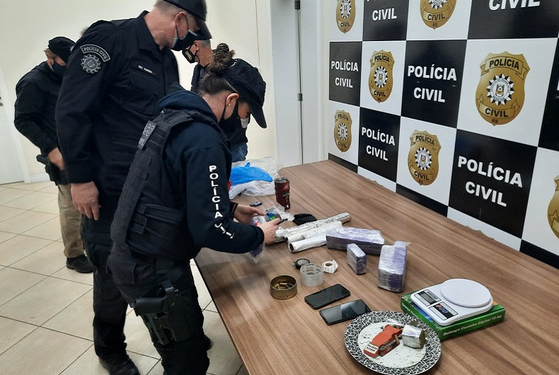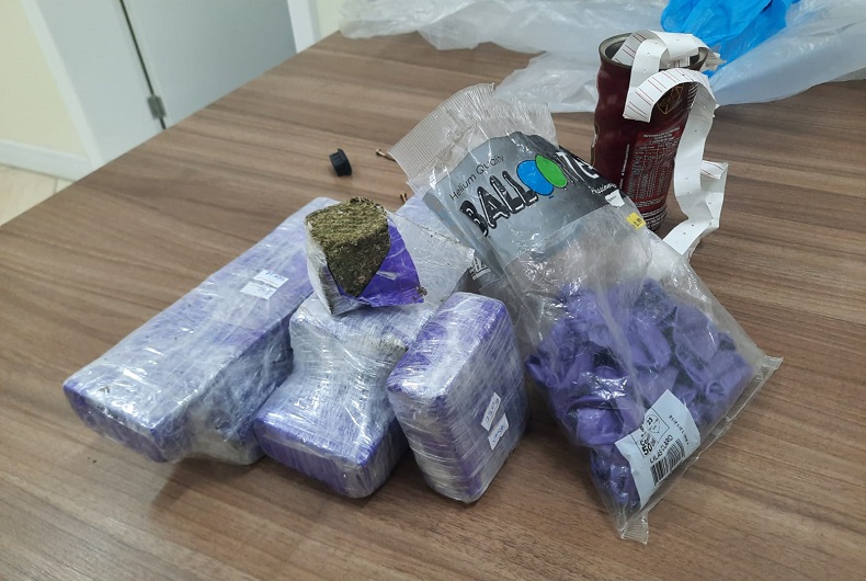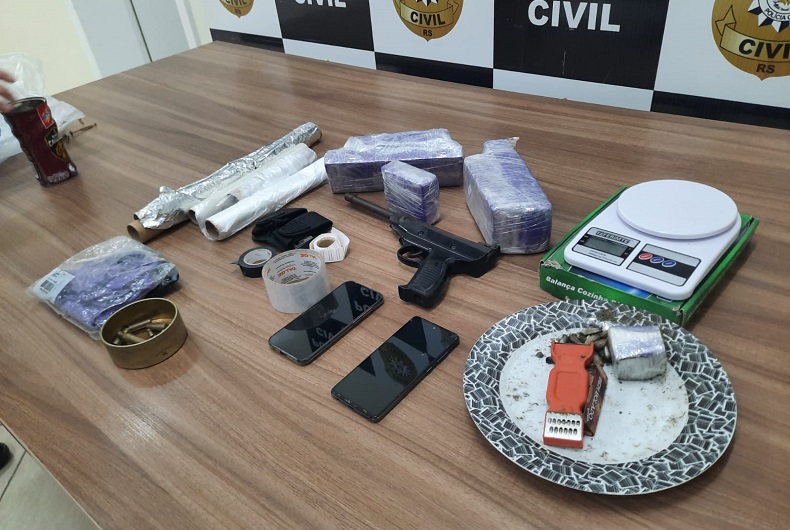 Na casa onde os dois moram, foram apreendidos 2,5 quilos de maconha, uma arma de pressão adaptada para calibre 22 e estojos de munições calibre 22, 38 e 40, além de materiais para preparo e embalagem de drogas. Um detalhe que chamou atenção da polícia foi o armazenamento das drogas em balões de festa. Os agentes acreditam que o objetivo seja mascarar o cheiro do entorpecente. A droga apreendida estava escondida no quarto do casal.