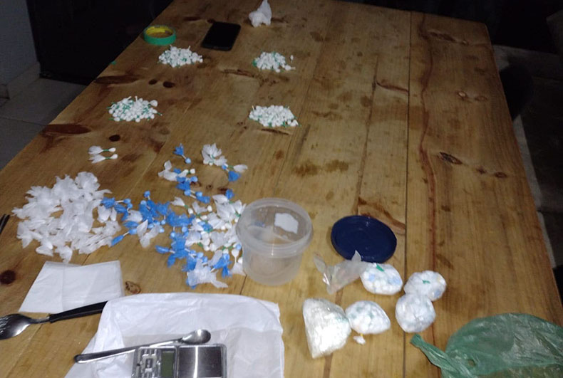 Próximo à piscina, na frente de um quiosque, havia uma mesa com grande quantidade de drogas. Ali estava a esposa de Zóio. Segundo a BM, a mulher, de 31 anos, cortava as pontas das buchas de cocaína dos papelotes. Parte do entorpecente já estava fracionada, em porções divididas em quatro cores, de acordo com cada quantidade em gramas. Na mesma parte da moradia, os policiais apreenderam outros itens.