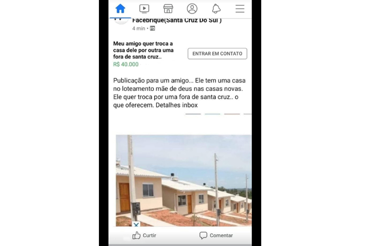 Moradores de projetos habitacionais de Santa Cruz do Sul afirmam que algumas moradias desses loteamento estariam sendo postas à venda pelas pessoas beneficiadas – o que é irregular. Em um dos casos, uma residência do Loteamento Berçário Mãe de Deus, no Bairro Santuário, foi oferecida por R$ 40 mil em um grupo de “briques” do Facebook. A postagem, que também propõe a troca por casa fora da cidade, já foi tirada do ar.