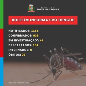 Boletim atualizado da Prefeitura de Santa Cruz do Sul aponta que o município está com 838 casos confirmados de dengue. Os dados, repassados na manhã desta quarta-feira, 28, ainda apontam 44 casos em investigação, ou seja, que aguardam o resultado dos exames. Não há nenhuma pessoa internada com dengue. Dois óbitos já foram registrados.