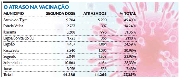 Em relação às vacinas, o Centro-Serra enfrenta o mesmo problema de outras regiões: o atraso na conclusão dos esquemas de imunização. A quantidade de pessoas que não retorna aos postos sobretudo para receber o primeiro reforço é significativa. Em Arroio do Tigre, para se ter uma ideia, das 9.704 pessoas que fizeram a segunda dose, apenas 4.414 voltaram para aplicar o reforço no prazo indicado pelo fabricante. Isso representa 45,49% de vacinas com período ideal de aplicação expirado, conforme os dados da Secretaria Estadual da Saúde.