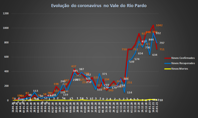 A situação do Vale do Rio Pardo no combate ao coronavírus finalmente começa a dar sinais de melhora, após várias semanas consecutivas registrando recordes de novos casos e de mortes causadas pela Covid-19. Também foi a primeira vez em longo período que o número de pessoas recuperadas foi maior que a quantidade de novos infectados. Por coincidência, essa evolução ocorre na mesma semana em que as primeiras doses da vacina começaram a ser aplicadas na população.