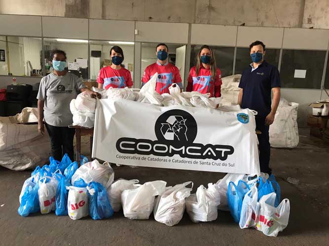 A campanha Faça o Bem Sem Olhar a Quem, ação conjunta do Rotary Club Santa Cruz Oeste e da Subseção da Ordem dos Advogados do Brasil (OAB) de Santa Cruz do Sul, realizou nessa terça-feira, 28, a entrega de kits de alimentos e de higienização a 53 colaboradores da Cooperativa dos Catadores e Recicladores de Santa Cruz do Sul (Coomcat).