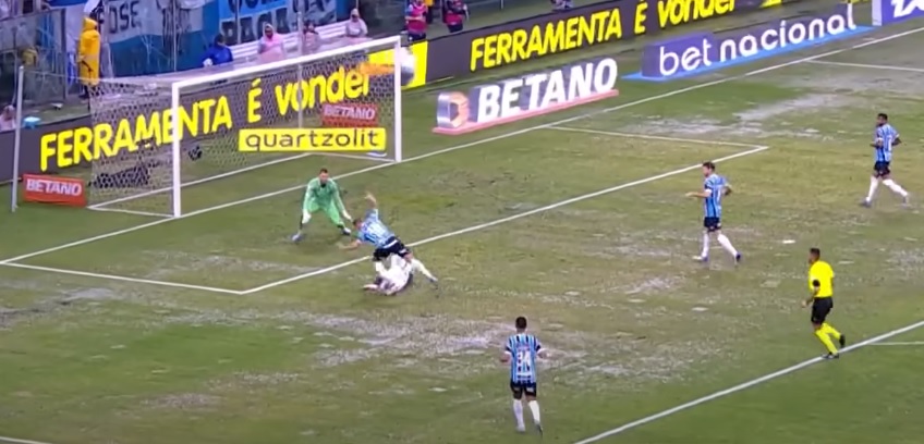 Logo na sequência, Bruno Méndez atinge Lucas Besozzi com um carrinho violento. “Possibilidade de cartão vermelho. Pega em cima do tornozelo (do jogador gremista), tem dobra de articulação, sem necessidade. Vou recomendar a revisão na cabine”, aponta Traci.
