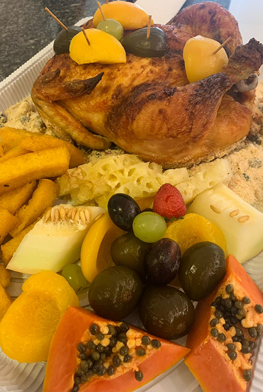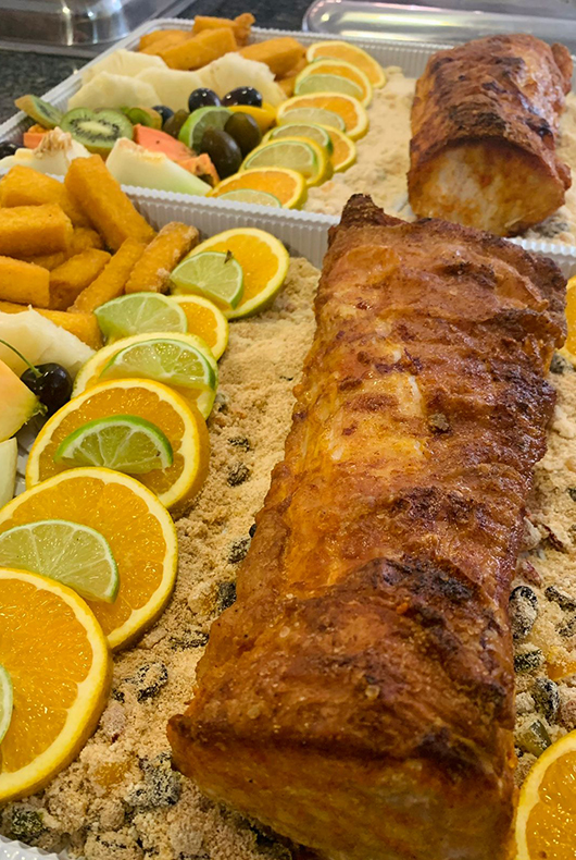 - 1,3 quilo de lombo assado, 800 gramas de arroz (branco e/ou à grega), 10 polentas, 250 gramas de farofa, 600 gramas de salpicão, 600 gramas de maionese e frutas decorativas.