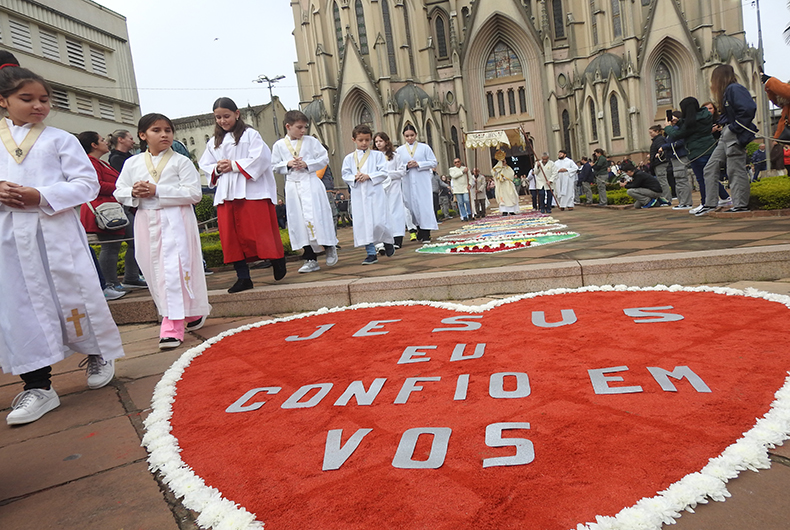 Caridade é Eucaristia. Foi com essa mensagem, e um enfoque voltado aos atingidos pelas enchentes que devastaram grande parte das cidades do Estado, que o bispo dom Aloísio Dilli deu início à missa de celebração ao dia de Corpus Christi dessa quinta-feira, 30, em uma Catedral São João Batista completamente lotada pelos fiéis. As demonstrações de fé e devoção podiam ser vistas já no pátio do templo, com os tradicionais tapetes coloridos.