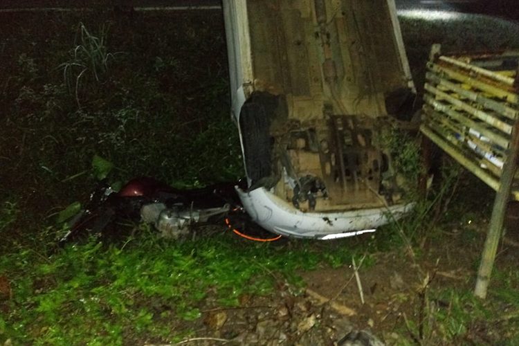 A moto era tripulada por um rapaz e no automóvel estava um casal. Segundo os bombeiros, o carro ia fazer uma conversão à esquerda para entrar em uma propriedade quando a moto acabou batendo na lateral do veículo. Com o impacto, o Celta capotou e os dois veículos foram parar em uma valeta. De acordo com os bombeiros, ninguém ficou ferido e foram registrados somente danos materiais.