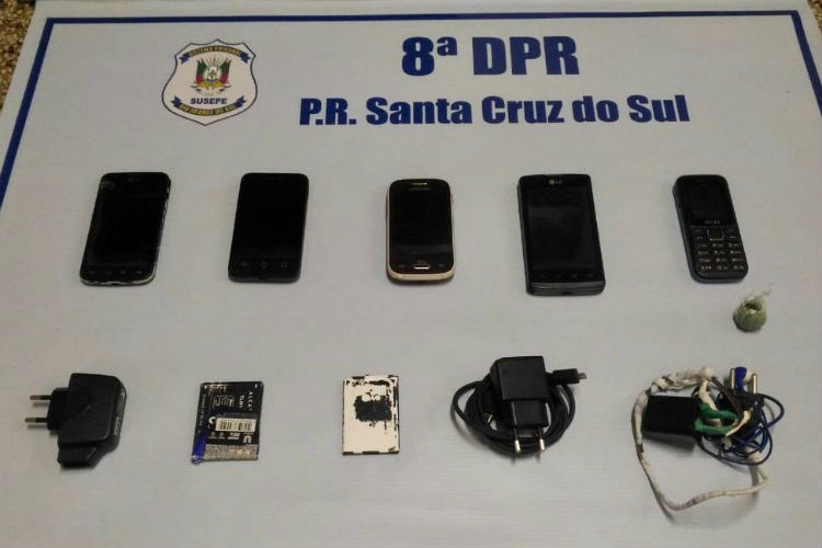 Durante uma revista de rotina em uma das celas do Presídio Regional de Santa Cruz do Sul na manhã desta sexta-feira, 10, foram encontrados cinco celulares, três carregadores de celular, duas baterias de celular e uma peteca de substância semelhante a maconha.