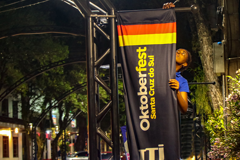 Faltando pouco mais de uma semana para a 37ª Oktoberfest e Feirasul, teve início às 19 horas dessa segunda-feira, 26, no centro de Santa Cruz do Sul, a colocação das primeiras bandeiras nos arcos da Rua Marechal Floriano. O trabalho começou nas proximidades do Monumento ao Imigrante e deve ser concluído até esta quarta-feira, 28, se o tempo colaborar.