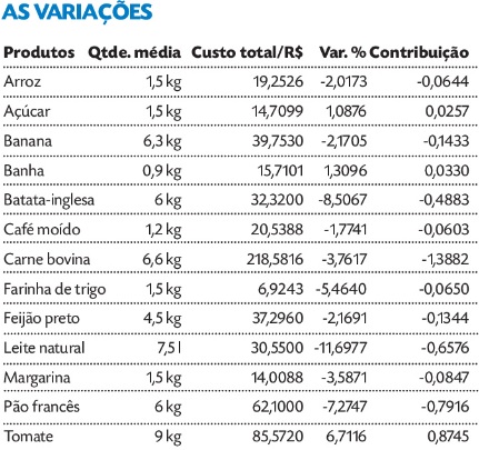 As maiores contribuições para a redução foram da carne bovina (-1,388%, continuando a queda de preços verificada no início de setembro), do pão francês (-0,791%, cujo preço também havia baixado em setembro) e do leite tipo C (-0,657%). Os produtos que frearam uma queda maior no valor total foram o tomate (contribuição de 0,874%), a banha (0,033%) e o açúcar (0,025%).