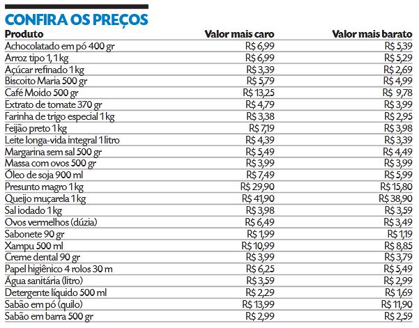 A comparação entre a lista mais cara e a mais barata mostra que pesquisar preços é a melhor alternativa para o consumidor. A lista de menor valor foi encontrada por R$ 170,44, enquanto a mais cara saiu por R$ 187,77, diferença de 10,15%.