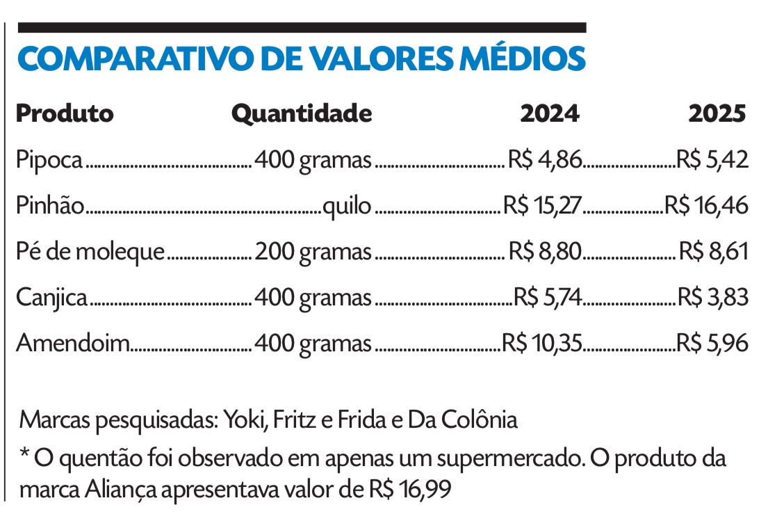 O produto que mais subiu de preço foi a pipoca, com uma variação de 11,52% em relação a 2024. Em seguida vieram o quentão – aumento de 11,12% – e o pinhão, que teve acréscimo de 7,79%. Na queda de preços, o amendoim lidera a lista, com diminuição de 42,42%. Na sequência vêm a canjica – 33,28% mais barata – e o pé de moleque – uma redução de 2,16%.