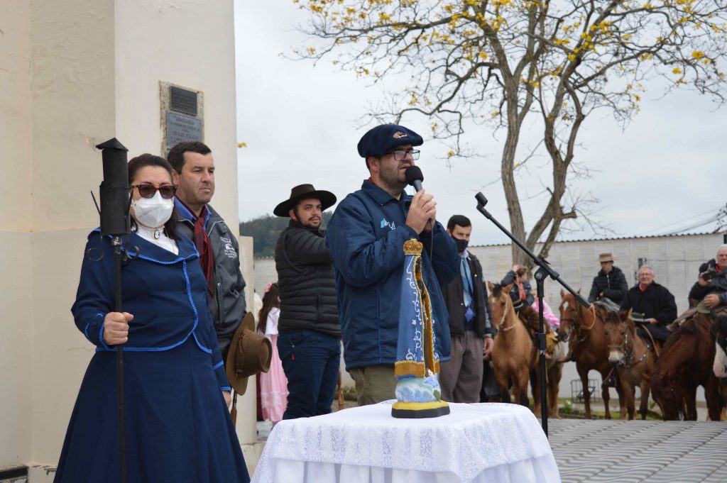 Posicionados em frente ao templo, os cavaleiros receberam a bênção do padre Matheus Venturini e prestaram homenagem ao padre gaudério, Jorge Hudson, tradicionalista e participante de cavalgadas, falecido neste ano por complicações da Covid-19. Após a bênção, cavalgaram em direção a Loja Maçônica Aôr e Harmonia, no bairro Vera Cruz, onde a chama permanecerá até o início dos Festejos Farroupilhas deste ano.