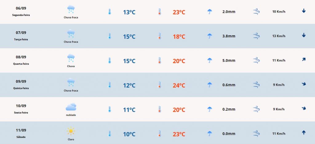 A partir de quinta, 9, e sexta, 10, um ar seco ingressa no Estado diminuindo a ocorrência de chuva. Há queda leve de temperatura com mínimas perto dos 10 graus.