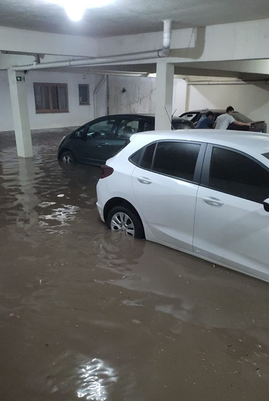 O grande volume de chuva em poucos minutos inundou a garagem de um prédio localizado na esquina das ruas Augusto Spengler e 28 de Outubro, no Bairro Universitário, em Santa Cruz do Sul. O espaço fica abaixo do nível da via e tem acesso pela Augusto Spengler, que foi por onde a água invadiu. Vídeos gravados pelos moradores e postados nas redes sociais dão a dimensão dos prejuízos, tendo em vista que carros ficaram parcialmente submersos e outras infraestruturas da construção também foram afetadas.