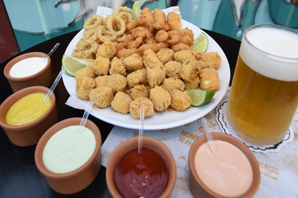 Como é o prato? Um combinado de camarão crocante, isca de peixe, bolinho de bacalhau e anéis de lula . Servidos com condimentos e a opção de molho extra. Vale provar o molho do Capitão Barba Negra. O prato sai por R$ 38 e serve de duas a três pessoas.