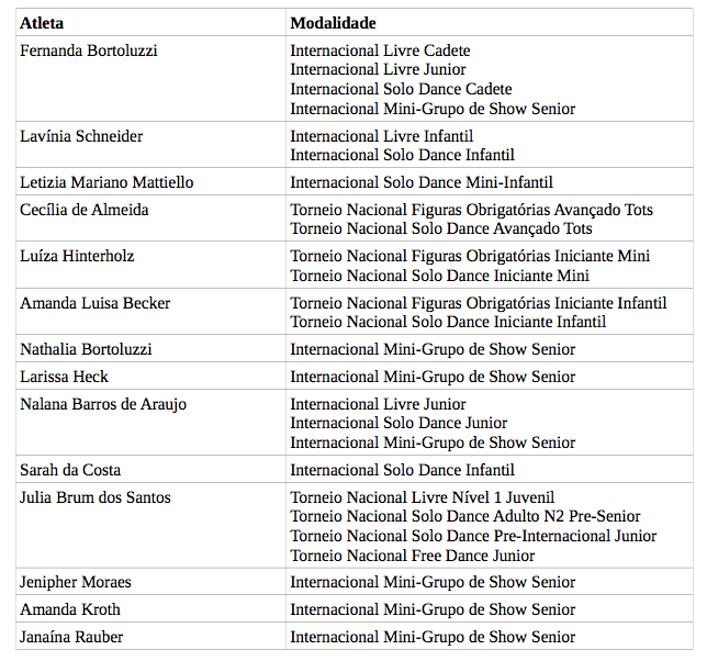 As atletas são dirigidas pelas técnicas Maria Regina Lenhard Kafer, Bruna Karnopp e Mariana Gassen. O mini-grupo de show Together estará disputando o campeonato, sob coordenação técnica de Nayara Simões, Júlia Balthazar e Maria Regina Lenhard Kafer. A viagem da delegação ocorreu nesta quinta-feira, 5