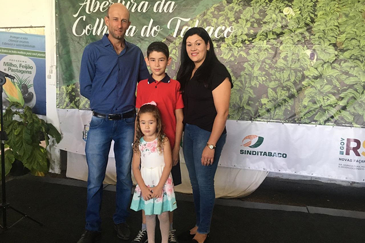 A abertura oficial da colheita ocorreu pela primeira vez em uma lavoura do tipo Burley. Os anfitriões do evento, Jeferson Stertz, de 39 anos, e Simone Catieli Chaves Stertz, de 33 – pais de Erick, de 11, e Isadora, de 4 anos –, cultivam tabaco Burley há 15 safras. Na propriedade de 60 hectares também há produção de aveia e trigo no inverno, e de milho (após a colheita do tabaco) e soja no verão.