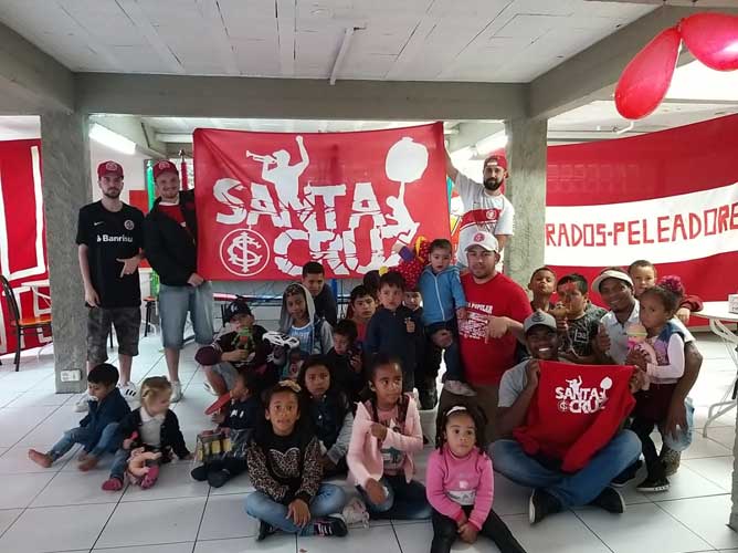 No dia 27 de outubro, a Guarda Popular, que existe em Santa Cruz desde 2006 – ano em que o Inter faturou a Libertadores pela primeira vez e o Mundial – promoveu a entrega dos brinquedos e a distribuição de lanches às crianças, que puderam se divertir também em uma cama elástica oferecida gratuitamente pela torcida. “O Inter é chamado de Clube do Povo. Então, nada mais justo do que ajudarmos o nosso povo. Temos o dever de sermos úteis à sociedade. Queremos realizar todos os tipos de ações sociais possíveis”, afirma Joel Alves Machado, o Chiquinho, um dos fundadores do grupo em Santa Cruz e dono do bar onde os integrantes se encontram.