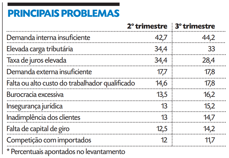 A taxa de juros elevada foi o terceiro problema mais significativo, indicado por 28,4% das empresas. Foi o item que registrou o maior recuo em termos absolutos ante o trimestre anterior: baixa de seis pontos percentuais.