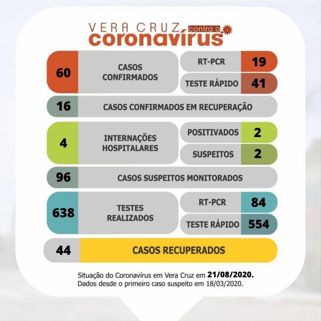 Vera Cruz possui 60 casos confirmados de coronavírus desde o início da pandemia. Dezesseis casos estão ativos, sendo que, destes, duas pessoas estão hospitalizadas. No município, 44 pessoas são consideradas recuperadas e até o momento não foi registrado nenhum óbito causado pela doença.