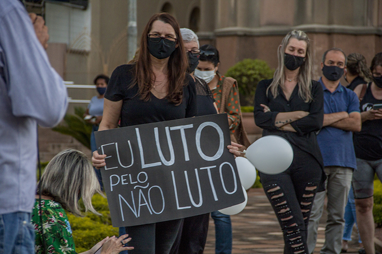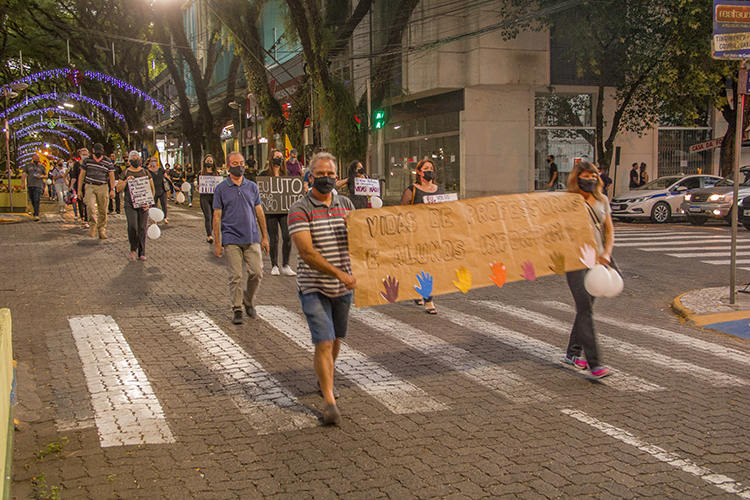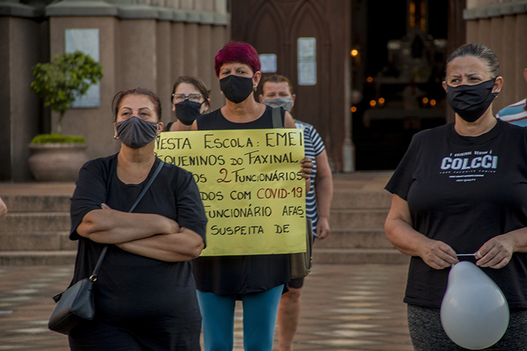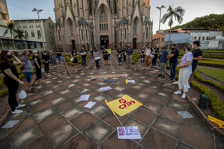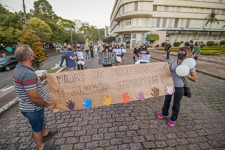 Um grupo com cerca de 40 pessoas – entre sindicalistas, professores e servidores das redes públicas municipal e estadual e simpatizantes da causa – participou de um protesto na noite desta terça-feira, 8, em Santa Cruz do Sul. O ato iniciou em frente à Catedral São João Batista, onde aconteceram pronunciamentos, e seguiu em caminhada silenciosa pela Rua Marechal Floriano, até o Palacinho, sede da Prefeitura. Os professores carregavam faixas e cartazes com dizeres como “O ano letivo se recupera, vidas não”, “Vidas de professores e alunos importam” e “Eu luto pelo não luto”.