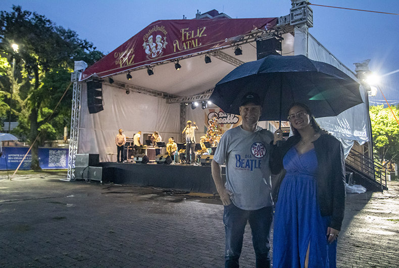 Mesmo que de forma abreviada em função das chuvas, a 18ª edição do Dia Beatle foi realizada nesse domingo, 3, à noite, na praça Getúlio Vargas. O evento tinha ocorrido pela última vez de forma presencial em 2019 (nos dois anos seguintes foi remoto, em função da pandemia, e, no ano passado, cancelado por conta da instabilidade). Quebrando o “jejum”, os fãs conferiram às rápidas apresentações de duas das atrações que estavam confirmadas: a Santa Brass Band e a dupla Gerson e Duda Nyland. Abaixo de guarda-chuvas e abrigado em parte da estrutura da praça de alimentação, o público se mostrou animado pela possibilidade de conferir os clássicos dos seus ídolos, e não arredou pé.