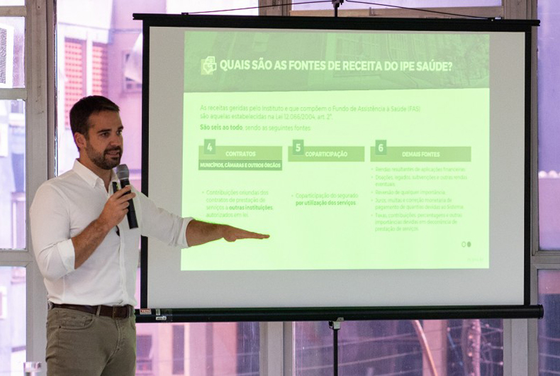 O governador Eduardo Leite apresentou nesta quarta-feira, 12, um diagnóstico sobre a atual situação do IPE Saúde, que é responsável pela assistência médica e hospitalar de um a cada dez gaúchos. Na ocasião, foram detalhados os dados da instituição, funcionamento, perfil dos segurados, fontes de financiamento e, especialmente, aspectos relativos aos desafios financeiros para a sustentabilidade do sistema. O diagnóstico, divulgado a deputados, secretários e imprensa na sede do IPE Saúde, irá orientar a proposta de reestruturação da instituição.