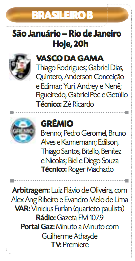Único invicto na Série B, o Vasco superou o momento de pressão e agora é o vice-líder, com 17 pontos, atrás apenas do Cruzeiro, que tem 22. A turbulência que antes estava no Rio de Janeiro agora se encontra em Porto Alegre. Sem vencer há quatro jogos, com três empates seguidos, o Grêmio saiu do G-4 e é o quinto colocado, com 13 pontos. “O momento de pegar o Grêmio talvez seja o pior possível. Sabemos a camisa pesada que eles têm, querem mudar essa situação. O Vasco passava por esse mesmo momento até pouco tempo atrás. Máximo respeito ao adversário, máximo respeito ao jogo. Uma grande partida, um grande desafio”, disse o técnico do time cruzmaltino, Zé Ricardo.