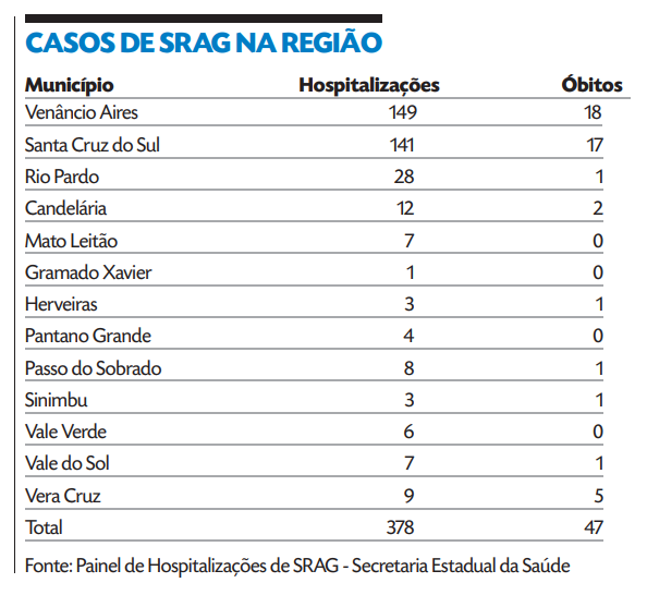 O número de hospitalizações e mortes provocadas pela Síndrome Respiratória Aguda Grave (Srag) segue crescendo no Vale do Rio Pardo. Na área da 13ª Coordenadoria Regional de Saúde – que abrange Candelária, Gramado Xavier, Herveiras, Mato Leitão, Pantano Grande, Passo do Sobrado, Rio Pardo, Santa Cruz do Sul, Sinimbu, Vale do Sol, Vale Verde, Venâncio Aires e Vera Cruz – o acumulado de internações chegou a 378. Ao todo, 47 pessoas faleceram em função da doença.