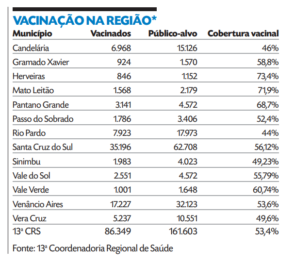 Na avaliação da responsável pela 13ª CRS, Mariluci Reis, embora os municípios estejam fazendo a sua parte e buscando formas de ofertar o imunizante, a população não está aderindo à vacinação. “É uma opção da pessoa não se vacinar. Não se pode obrigar, mas é muito importante. Enquanto isso, as unidades de tratamento intensivo estão cheias e os hospitais lotados”, alerta.