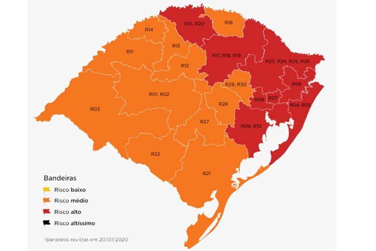 Já as regiões de Porto Alegre, Canoas, Capão da Canoa, Taquara, Novo Hamburgo, Palmeiras das Missões, Passo Fundo e Caxias do Sul, permanecem com a bandeira vermelha representando áreas de alto risco de transmissão do coronavírus no Estado. As novas determinações são válidas de 21 a 27 de julho.