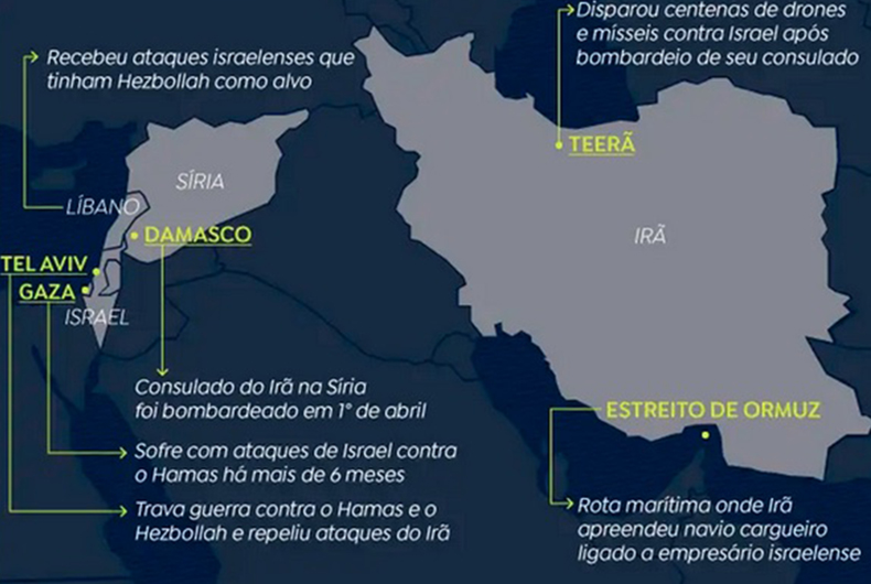 O Irã lançou sobre Israel, no sábado, centenas de drones em resposta ao ataque ao consulado iraniano em Damasco (veja na arte acima). A ofensiva, que atraiu as atenções globais, representa uma mudança na situação do Oriente Médio e pode levar a uma escalada nos conflitos na região, de acordo com especialistas. A situação evidenciou alianças e mostrou claramente um posicionamento iraniano.