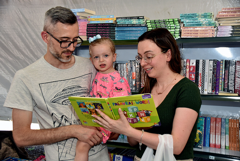 Com apenas 2 anos, Marcela Schwab olhava atentamente as publicações colocadas nas bancas sob o lonão. Eram muitas cores e opções, mas ela conseguiu garantir alguns exemplares. Santa-cruzenses, seus pais, Helena Nether e Tiago Schwab, aproveitaram a visita do almoço desse domingo na família e deram uma passada no evento, que teve acesso gratuito. “Ela [Marcela] gosta muito de livros e em eventos como esse conseguimos encontrar mais variedade”, comentou Helena. Com personalidade, a menina optava pelos que já contam uma história, mesmo com 2 anos. Daí vem a perspicácia da mãe e seleciona aqueles que têm páginas cartonadas, que são mais duráveis, para garantir a brincadeira da filha.