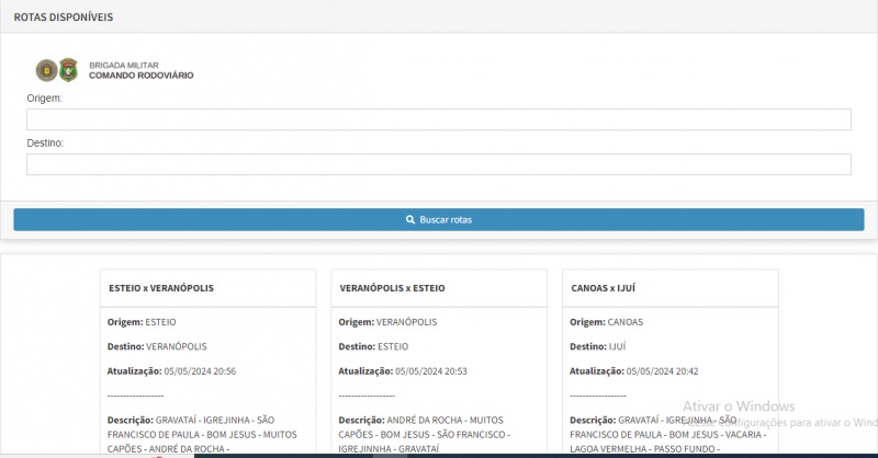 Começou a operar neste domingo, 5, a plataforma de rotas criada pelo Comando Rodoviário da Brigada Militar. Devido as fortes chuvas que atingiram o Rio Grande do Sul e devastaram algumas rodovias, os militares desenvolveram um sistema que mostra as rotas alternativas de ligação disponíveis entre os municípios. Por meio do link crbm.bm.rs.gov.br/rotas, o motorista será direcionado à página do Sistema de Rotas CRBM, onde poderá pesquisar os trajetos cadastrados e após escolher seu destino, ao clicar em “acessar rota”, será direcionado ao aplicativo de GPS e poderá iniciar seu deslocamento.